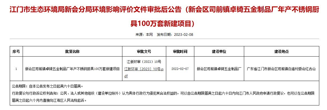 2月8日,江門(mén)市生態(tài)環(huán)境局新會(huì)分局就新會(huì)區(qū)司前鎮(zhèn)卓锜五金制品廠(chǎng)年產(chǎn)不銹鋼廚具100萬(wàn)套新建項(xiàng)目環(huán)境影響報(bào)告表作出審批意見(jiàn)并對(duì)外進(jìn)行公告,公告期限:自此公告發(fā)布之日起滿(mǎn)六十日屆滿(mǎn)。(來(lái)源:江門(mén)新會(huì)區(qū)人民政府)