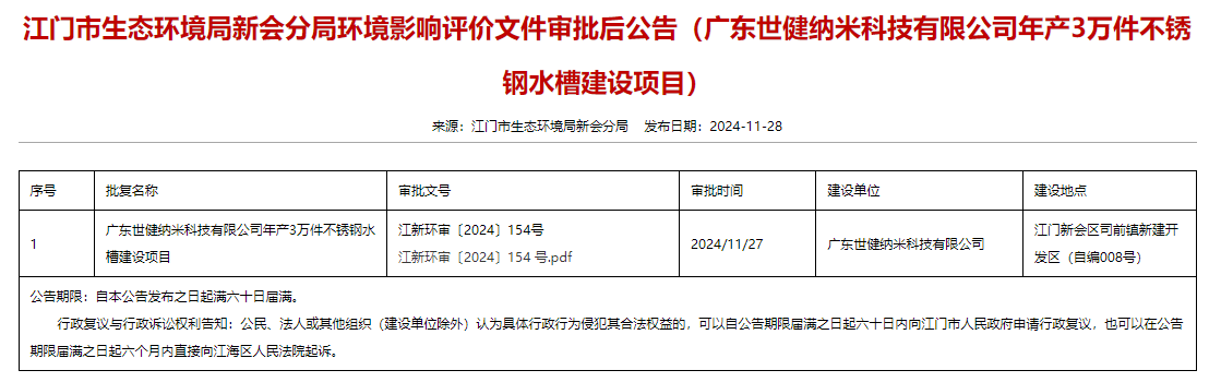 廣東世健納米科技有限公司年產(chǎn)3萬不銹鋼水槽建設(shè)項(xiàng)目環(huán)評(píng)獲審批公告